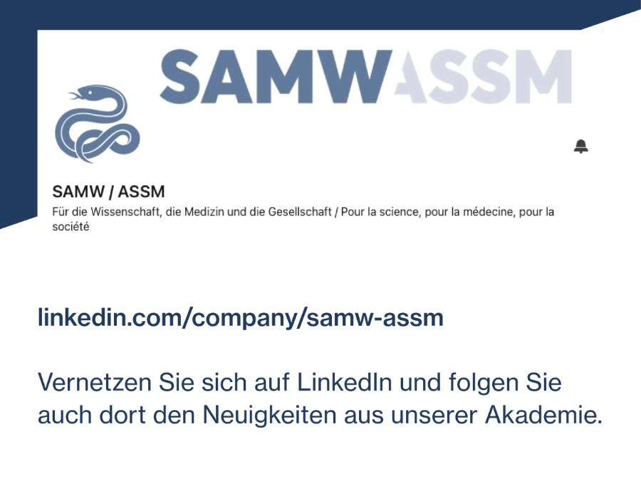 Wir freuen uns, Ihnen unsere Präsenz auf LinkedIn bekannt zu geben. Vernetzen Sie sich mit SAMW / ASSM und folgen Sie auch dort den Neuigkeiten aus unserer Akademie.