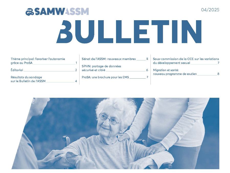Le Bulletin 4/2025 présente en outre plusieurs nouveautés: la brochure de ProSA pour les EMS, la sous-commission «Variations du développement sexuel» et le programme de soutien «Migration et santé». Des informations sur le Sénat de l’ASSM et sur SPHN, ainsi que les résultats du sondage sur le Bulletin complètent cette édition.