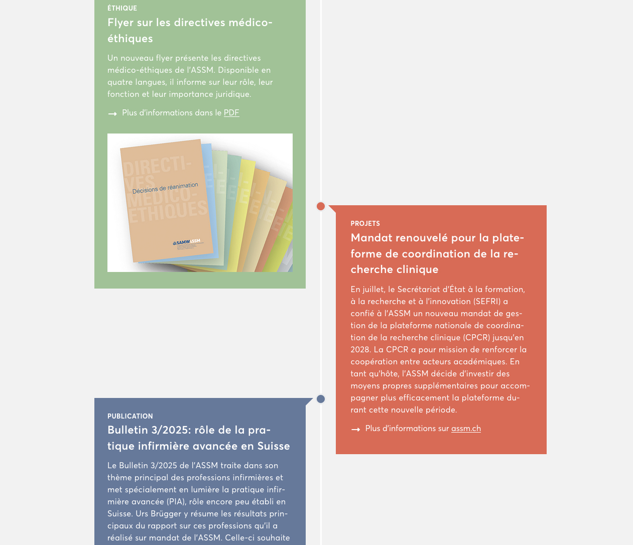 Dans le domaine de l’éthique, le travail sur les mesures de contrainte en médecine se poursuit et a fait l’objet d’un atelier très éclairant. Les directives relatives au diagnostic de la mort en vue de la transplantation d’organes ont fait l'objet d'une consultation publique et d'un large débat entre spécialistes. Le thème de l’assistance au suicide continue à susciter le dialogue au niveau sociétal et politique, avec de nouvelles thématiques, telles le don d’organes après un suicide assisté. En outre, une nouvelle sous-commission élabore des directives relatives aux variations du développement sexuel et aux questions médico-éthiques complexes qui y sont liées. Quant à l’important travail sur le projet de soins anticipé, il suit son cours avec la publication de recommandations sur l’établissement de ce projet pour chaque personne entrant en EMS.